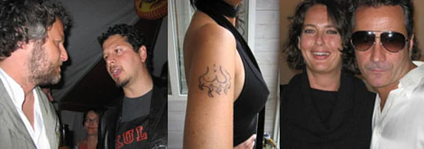 Left: Artists Tobias Rehberger and Juan Pedro Fabra Guemberena. Middle: Guemberena's “Ass on Fire” tattoo. Right: Curator Marianne Hultman and magazine editor Jan Walaker.