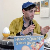 Rather than send out a written press release, gallery representatives personally telephone invitees, inaugurating a dialogue that constitutes the show’s artistic premise. Arriving at the gallery, visitors find the young British artist and storyteller Tris Vonna-Michell sitting opposite two chairs at a table, around which he has placed physical “props” to accompany his story. The artist asks how many minutes the visitor would like to listen, then sets an egg clock to determine when time is up. (My own experience suggests that eight minutes is a bit too short to accommodate the extremely dense tale.) The show’s title, “Down the Rabbit Hole,” is a nod to the moment in Lewis Carroll’s Alice in Wonderland when Alice exchanges reality for fantasy—a moment with many parallels to Vonna-Michell’s narrative, a tale of coincidences, the hunt for answers, and Stasi archives told in several acts that consistently blurs the line between fiction and reality. The quiet strength of Vonna-Michell’s voice in a dark room brings together disparate props, including a slide show, a video, news articles, objects (such as a paper shredder and a book on Humpty Dumpty), and photographs. Despite obvious comparisons to Fluxus and the more recent performance art of Tino Sehgal and John Bock, Vonna-Michell’s practice is in a class of its own.