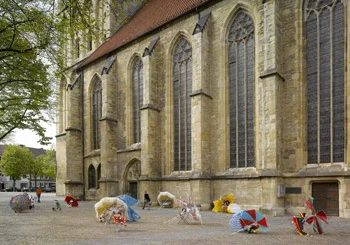 Grand old lady Isa Genzken, som i år også hadde soloutstilling i den tyske paviljongen i Venezia, har stilt ut i Münster to ganger tidligere (1987 og 1997). I år presenterte hun et Beuys-inspirert prosjekt bestående av et titall små forskjellige dukker plassert i diverse stoler med parasoller på plassen utenfor Liebfrauen-Überwasserkirche. Mitt reiseselskap hvisket noe om «Skadete muppets i solstoler». Selv lurer jeg på hvordan dette verket egentlig fungerer i møte med Münsters «vanlige» besøkende.