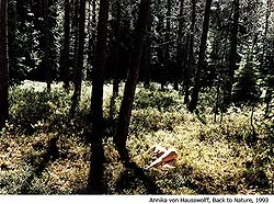 Å finne det gjengitte sitatet på veggen ved siden av Annika von Hausswolffs nå meget velkjente fotoserie Back to Nature fra 1993, (nakne damer, ihvertfall med buksene neddratt, liggende i naturmiljø), plassert midt imot Juan Pedro Fabra Guemberenas prints True Colours, (militære på øvelse i full mundur og sminket i svensk natur, vist i videoform på forrige Venezia-biennale) – er kanskje å overdrive det pedagogiske en smule. Man er her farlig nær å undervurdere publikums intelligens. Begge kunstnere og kunstverk er helt klart hardcoreinteressante og bra, men plassert sammen tar de noe av kraften fra hverandre, og med kuratorenes statement ved siden av blir man ikke mindre enn sjøsyk…